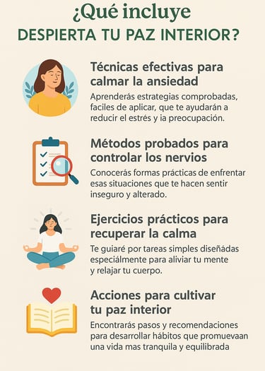 Despierta tu Paz Interior es un material digital completo y transformador que te enseña paso a paso cómo calmar tu mente, liberar la ansiedad y recuperar la serenidad que tu espíritu tanto anhela.